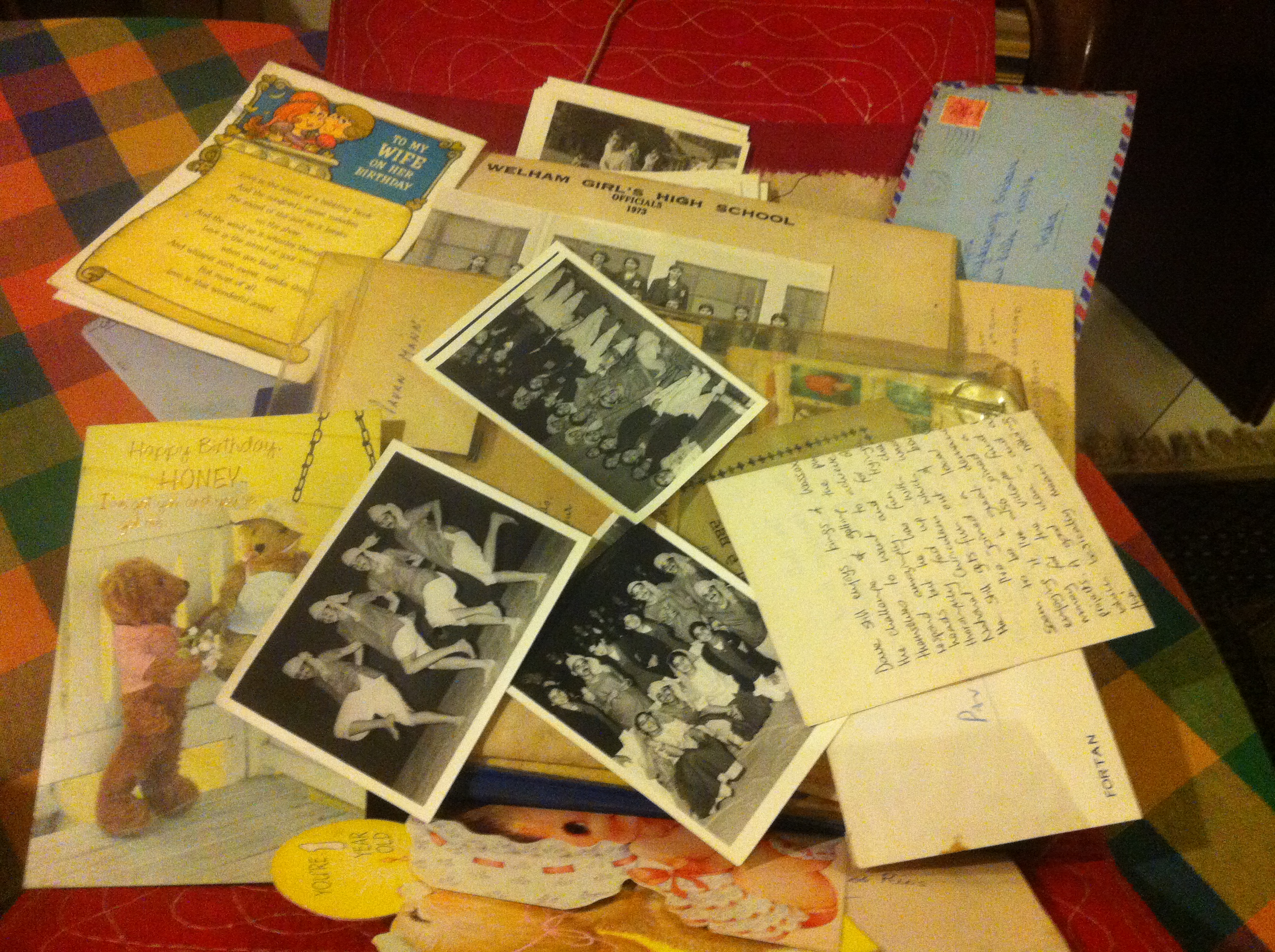 Trunks: those wonderful things that store everything – I have many – and I thought to get rid of them!! Obviously I didn’t – to start – it was the girls’ old files – report cards and letters – I was not able to throw out a single one. Then I found an old folder of all the cards that I had kept from my wedding – half those people are gone, but seeing those messages – obviously I just sat there, cried and packed them back into the folder. Backward in time to my own school files and dimmed letters from my grandfather, the ink is faded but the messages remain in that tiny scrawling hand, so many words of wisdom that carried me all this way.