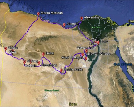ROUTE: Cairo – Alexandria – El Alamein – Marsa Matrouh – Siwa – Shiata Lake – Sitra – Nawamesa – Oasis of Baharia – Valley of Whales – Wadi al Rayan – Lake Qaroun – Cairo