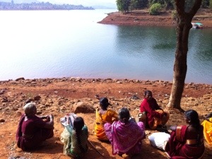 The car is parked under a large peepul tree beside the temple, we walk a few meters past down to the banks of a huge, sparkling lake. A gaggle of multi hued ladies sit under the tree waiting for the phut, phuting, colourful boat that soon appears to take us across the lake to the far shore.